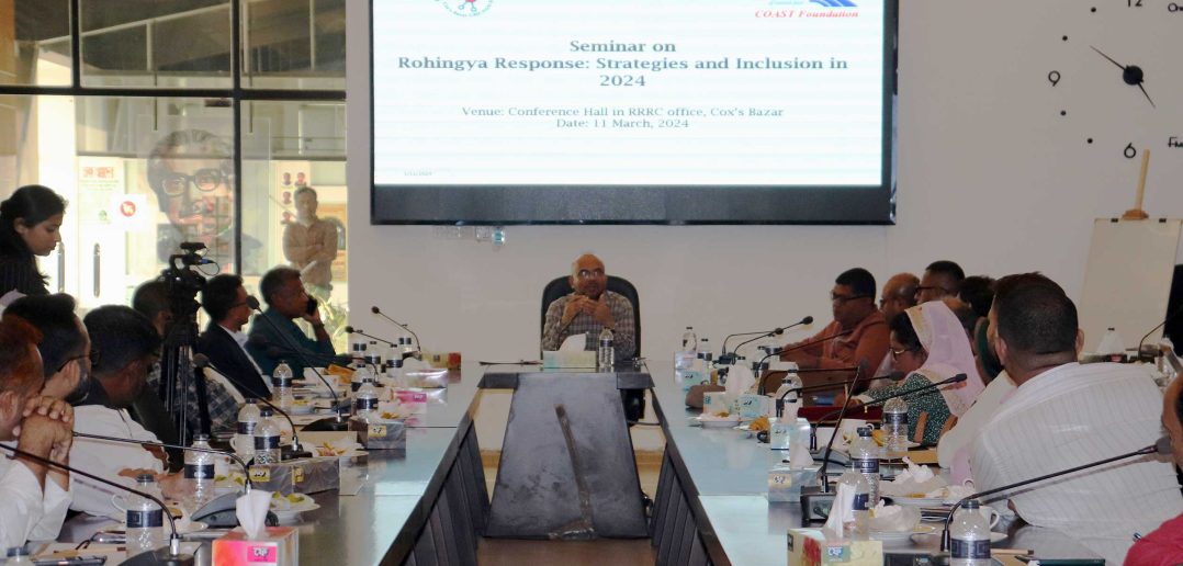 Cox’s Bazar, 11th March 2024: Today, a seminar titled “Rohingya Response in Cox’s Bazar: Strategies and Inclusion in 2024” is held at the RRRC (Refugee Relief and Repatriation Commissioner) office’s conference room. CCNF (Cox’s Bazar CSO NGO Forum) and COAST Foundation organised the seminar, which was chaired by the RRRC, Mr Mizanur Rahman. UNHCR representative Ms Yoko Akasaka, WFP Representative Ms Emmanula Mashayo, ISCG Deputy Leader Mr Vedha, three local Union Parishad Chairmen and several Union Parishad Members have participated in the seminar. The seminar was moderated by Zahangir Alam, Member Secretary of CCNF and Assistant Director of COAST and Rezaul Karim Chowdhury, the Co-Chair of CCNF and Executive Director of COAST.